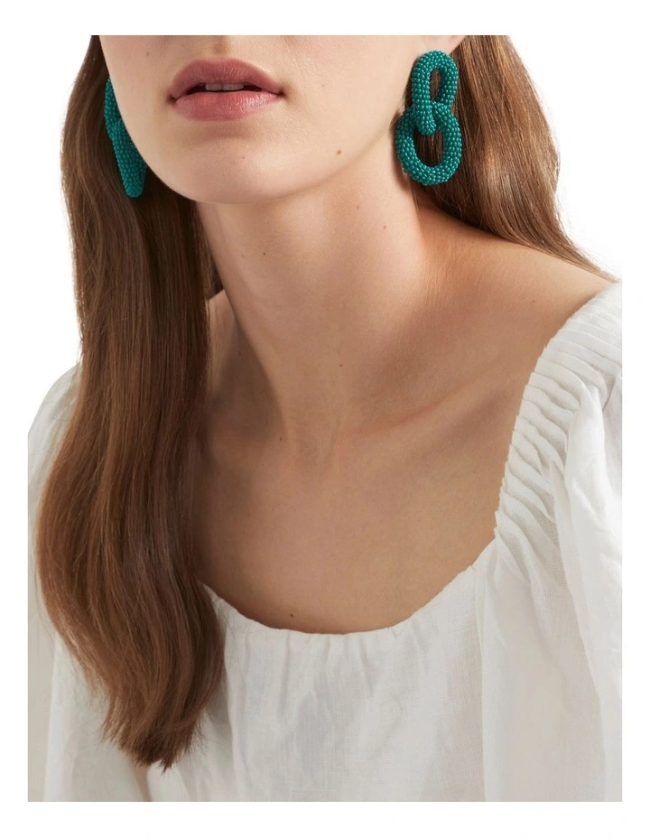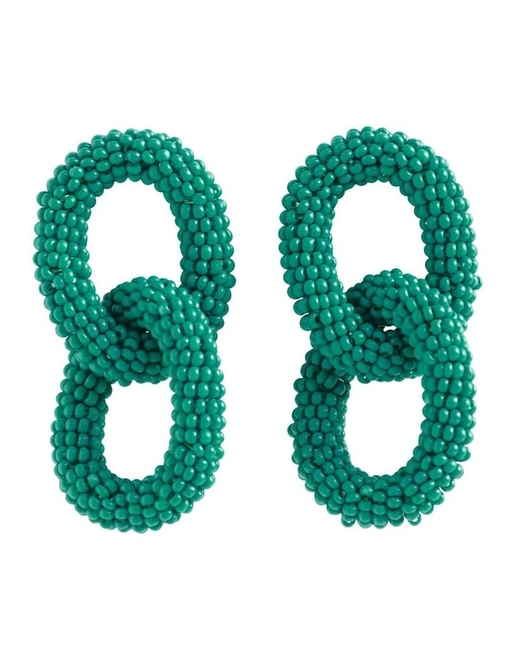 These earrings have a linked loop design, embellished with glass Seed beads. They fasten with a stud backing.