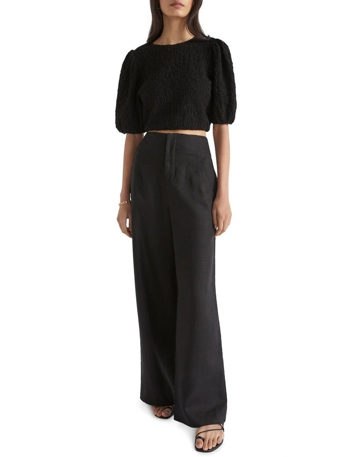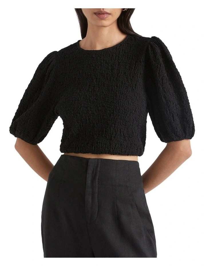 Crafted from a stretch cotton blend with a crinkle texture, this top is a wardrobe staple with a twist. It features a round neck and blouson sleeves, finishing at a crop length with an elasticated waist. By choosing our cotton products, you are supporting our investment in the Better Cotton mission.