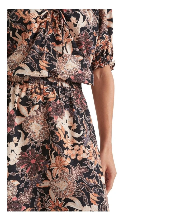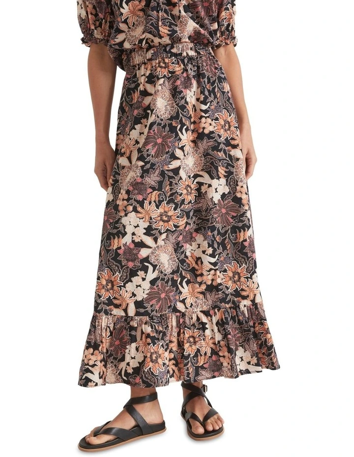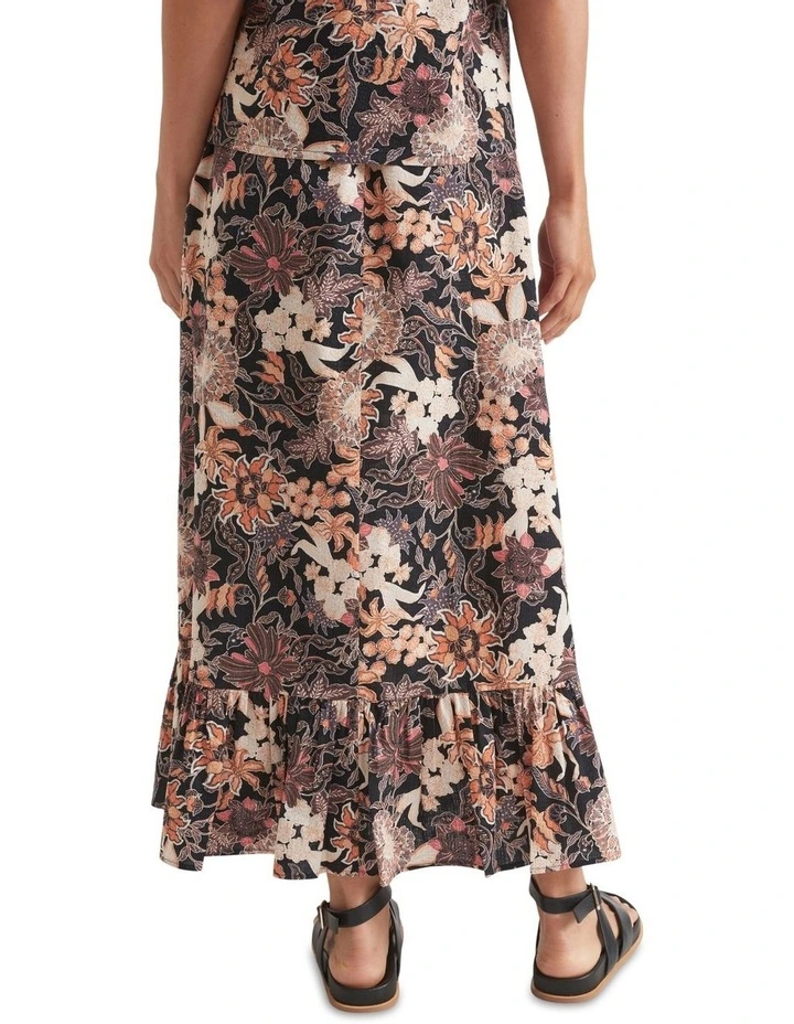This floral skirt falls to a midi length in an elevated, draped shape. The hem finishes with a ruffle.