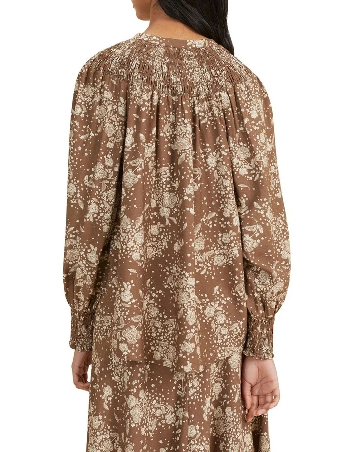 With a delicate floral print and a pretty smocked yoke, this blouse is sure to find a favoured spot in your wardrobe. It features bell sleeves with frilled, smocked cuffs, and is cut with movement through the body. The blouse buttons down the front.