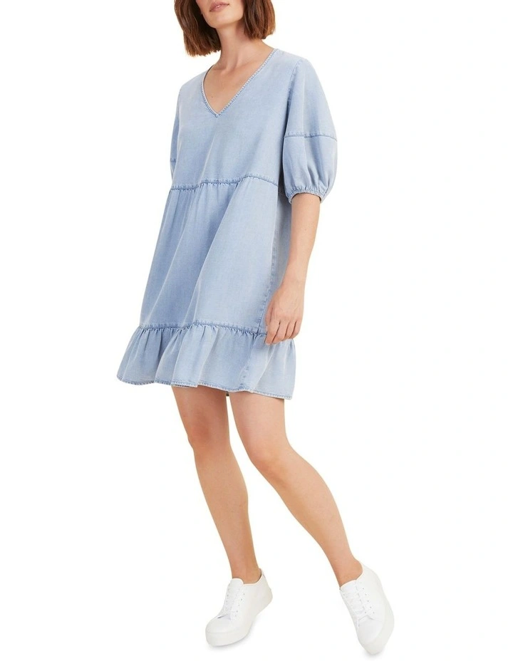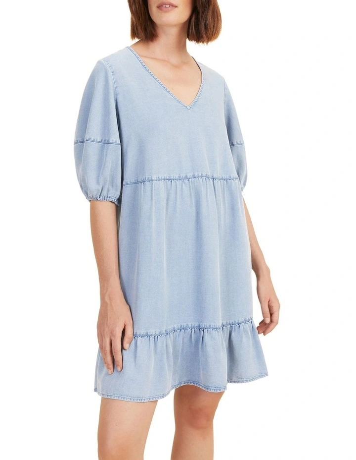 With a flowy silhouette and lyocell fabrication, this dress is sure to be a go-to all year round. The flattering V neckline and puff sleeves add femininity to the relaxed shape, and the skirt is tiered with gathering details and a frill hem.