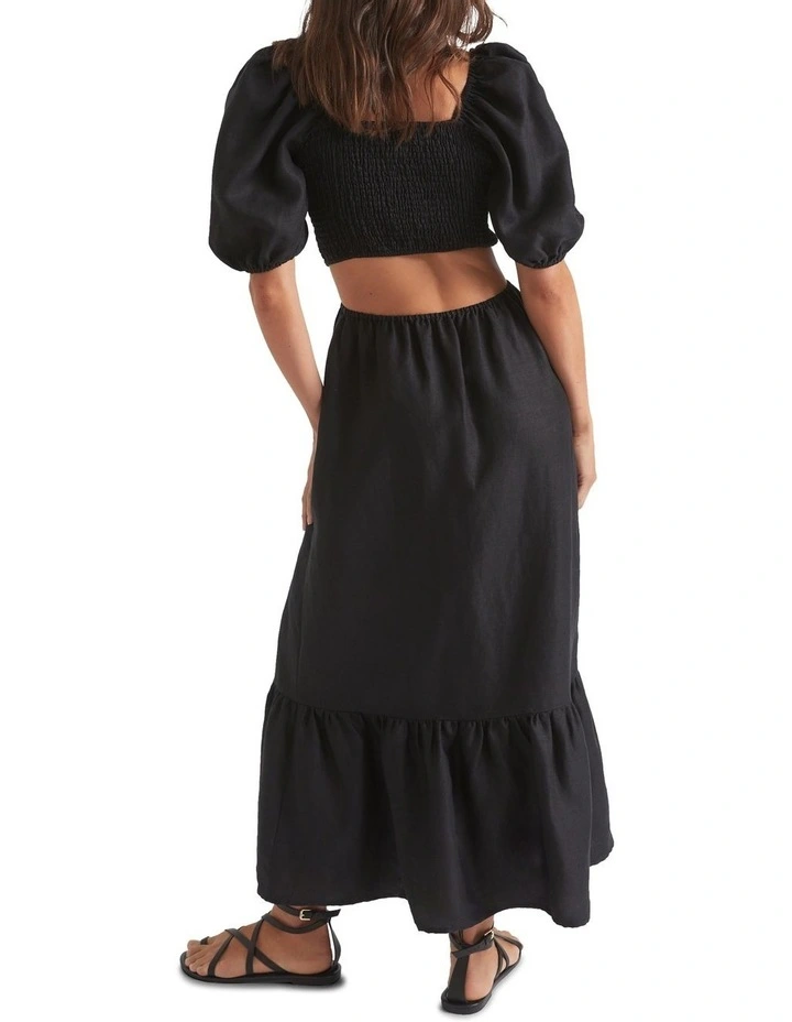 Crafted from premium French linen, this dress is a holiday essential. It features a square neckline leading into a shirred bodice with cutouts at the waist, balanced by puffed sleeves and falling to a midi length. Elevated and easy to wear.