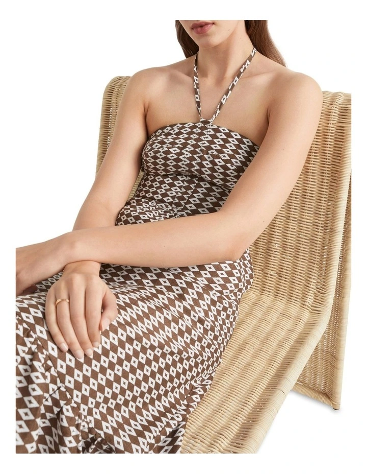 This midi dress is a must for your summer events. With a geo print and a halter neck, it has a fresh, modern feel. The dress is crafted from premium French linen.