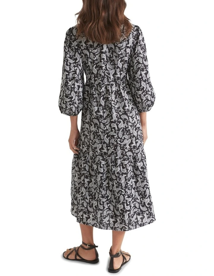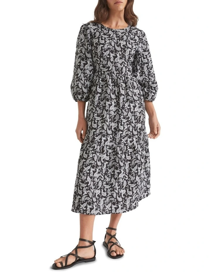 With elbow-length sleeves and a tiered design, this linen dress is a pleasure to wear. It features an all-over paisley print and falls to a midi length.