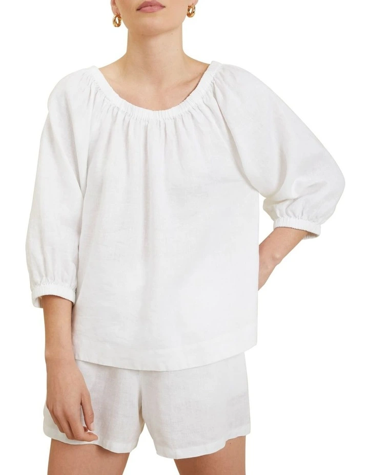 Soft stripes decorate the lightweight linen of this long sleeve blouse. Elastic at the neckline and cuffs elevates the peasant style silhouette of the blouse, which flows into an A-line shape with blouson style sleeves.