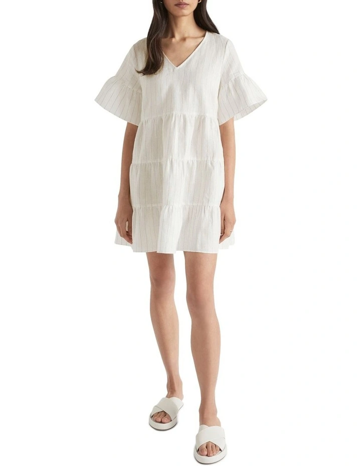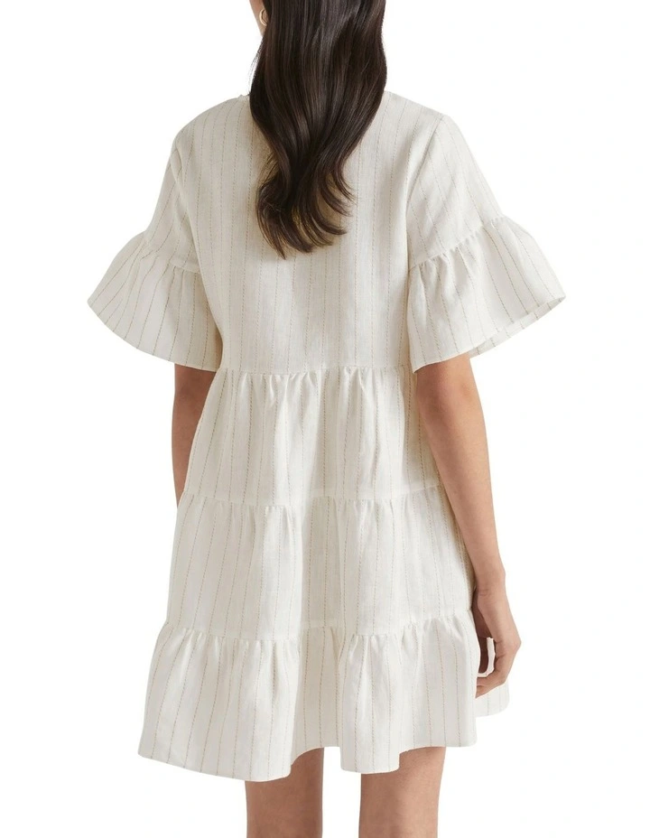 Crafted from a linen rich blend with cotton, this dress is easy to throw on and go. It features ruffled sleeves and a tonal stripe, falling in tiers to a mini length. An essential for easy holiday dressing.