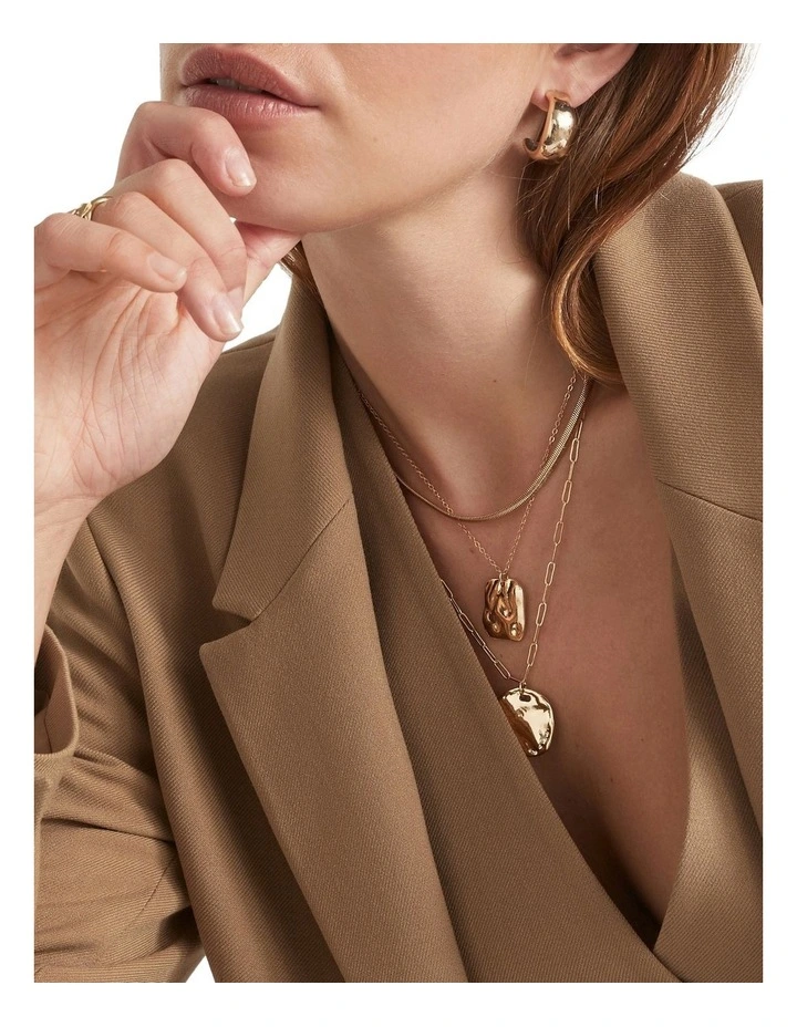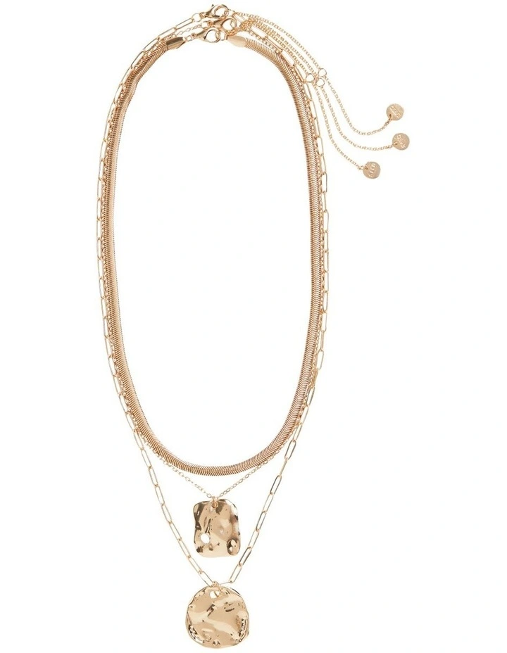 Add a little glamour to your look with this layered necklace. It features three chains, two of which are embellished with simple, modern pendants. The necklace closes with a clasp at the back of the neck.