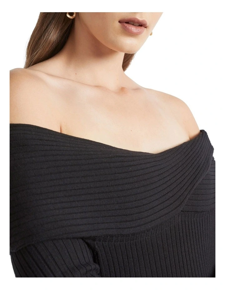 With an off-the-shoulder neckline and a fitted shape, this dress is an evening essential for the cooler months. It features a ribbed knit fabrication and falls to a midi length.