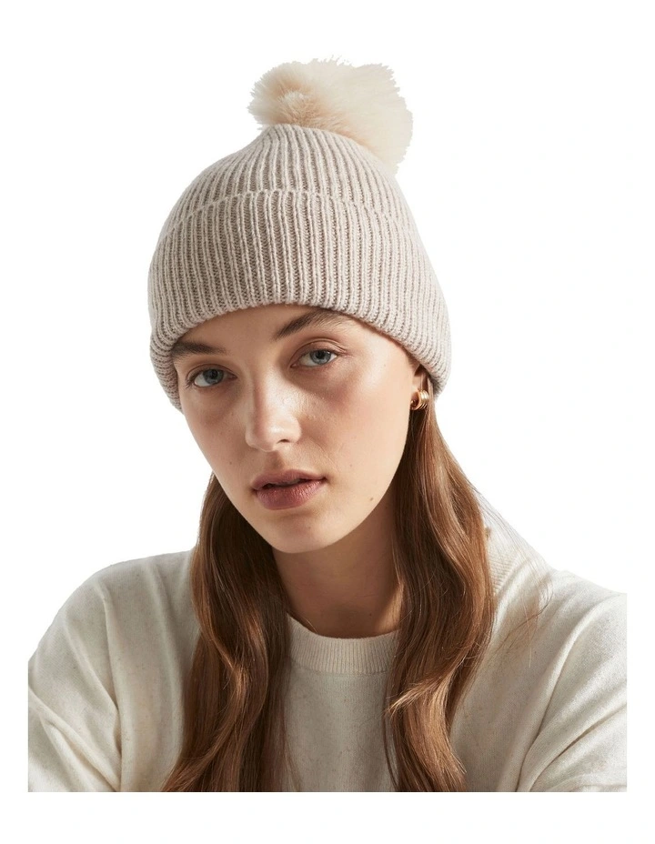 An essential piece for winter weekends, this beanie has a ribbed knit construction and is finished with a playful pom pom. It is crafted from a stretch-blend yarn with wool, cotton, and cashmere for a soft, comfortable feel.