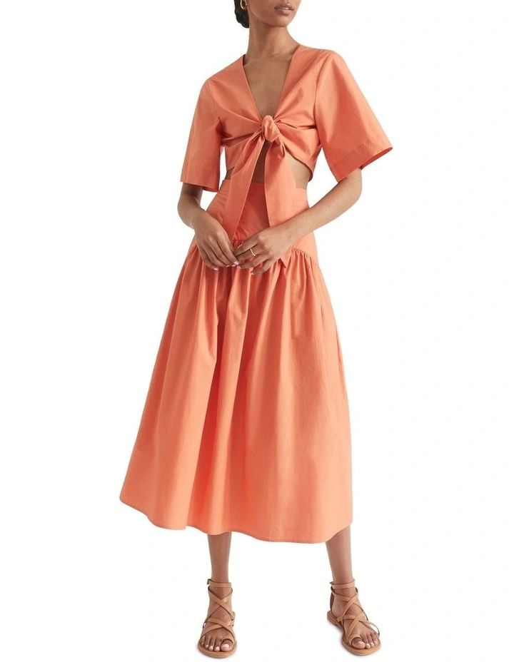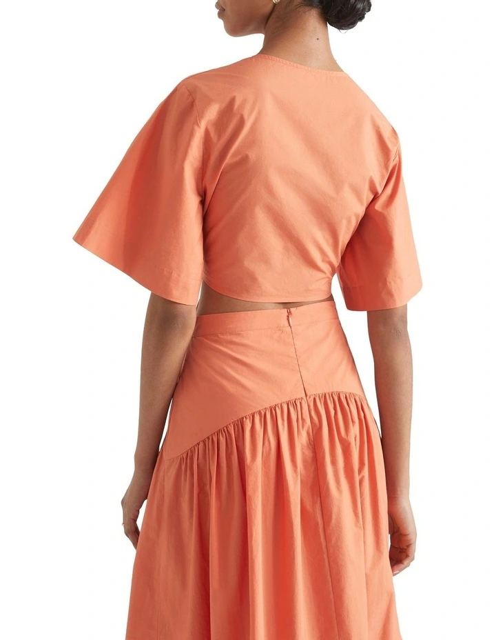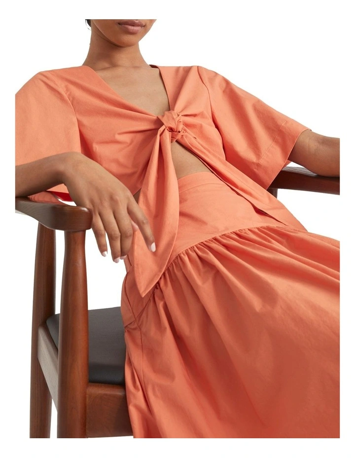 With a deep V neck and a tie front, this top makes a statement. Crafted from a smooth cotton poplin, the top features short sleeves and a cropped length.