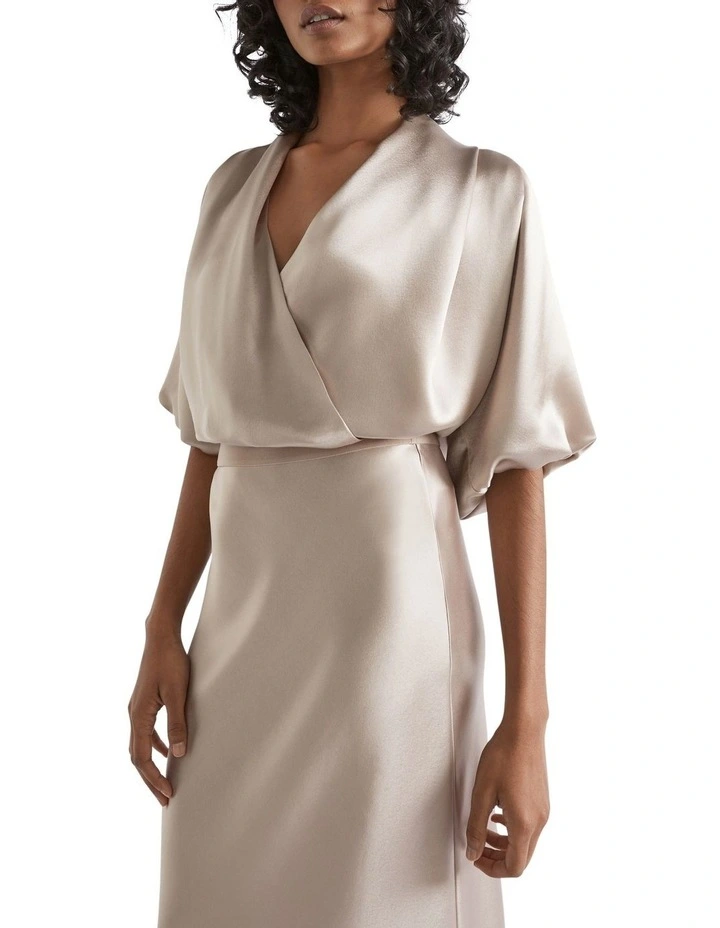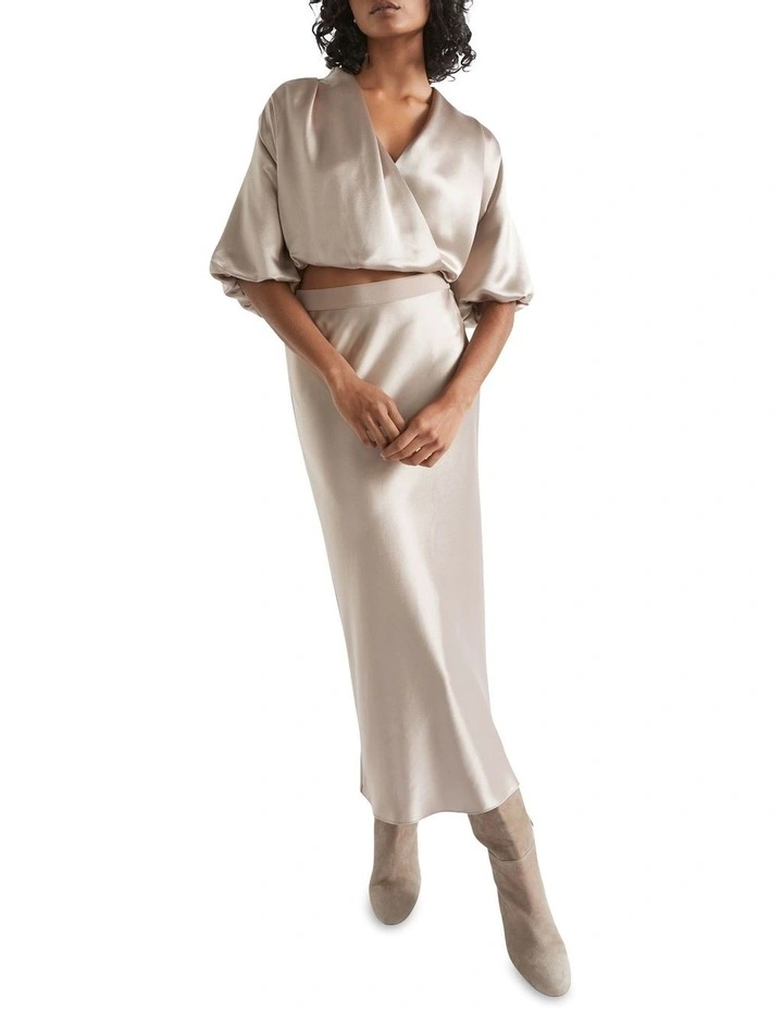 With a soft, draped look and a flattering V neck, this blouse deserves a spot in your wardrobe. It features short balloon sleeves and a gathered hem, finishing at a cropped length. Elegant and easy to style.