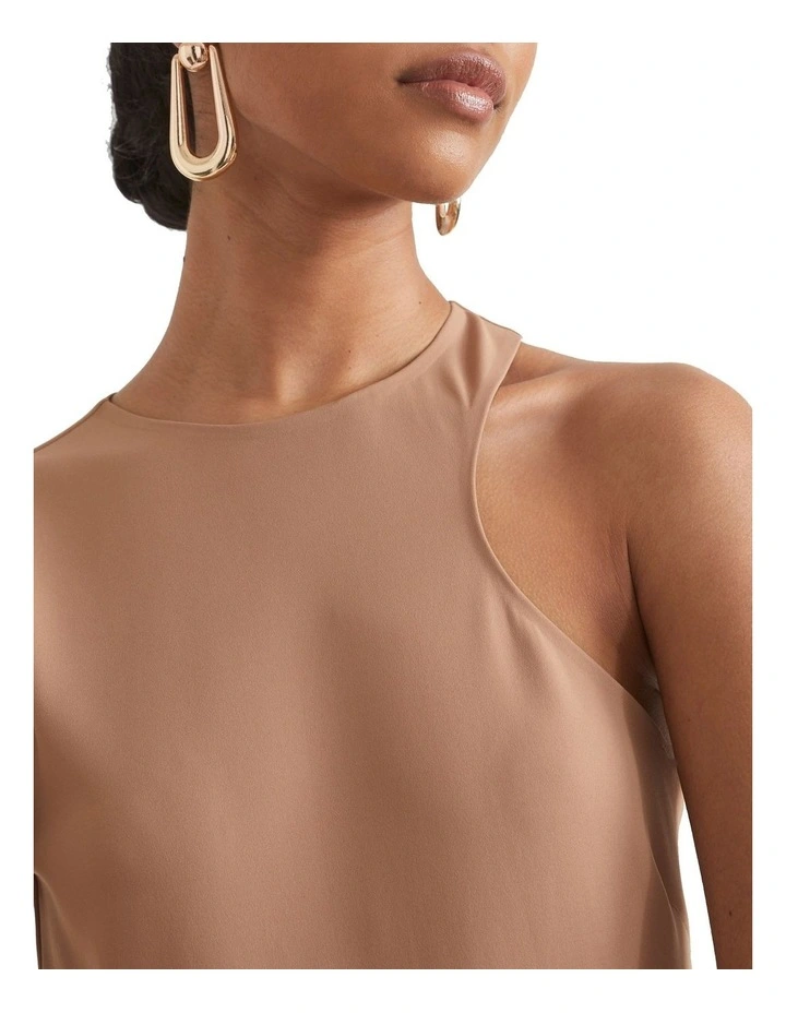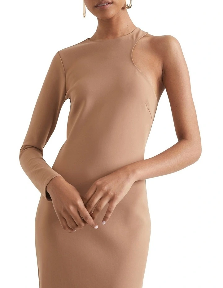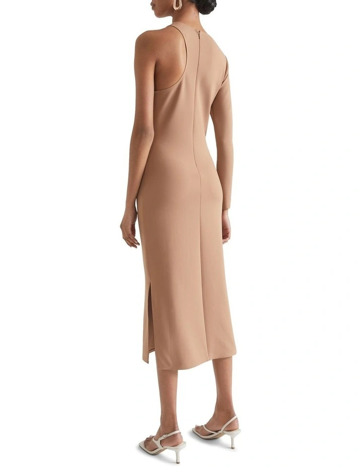 With a single long sleeve and a high neck, this dress has a sleek, modern style. With a side split, it falls to a midi length.