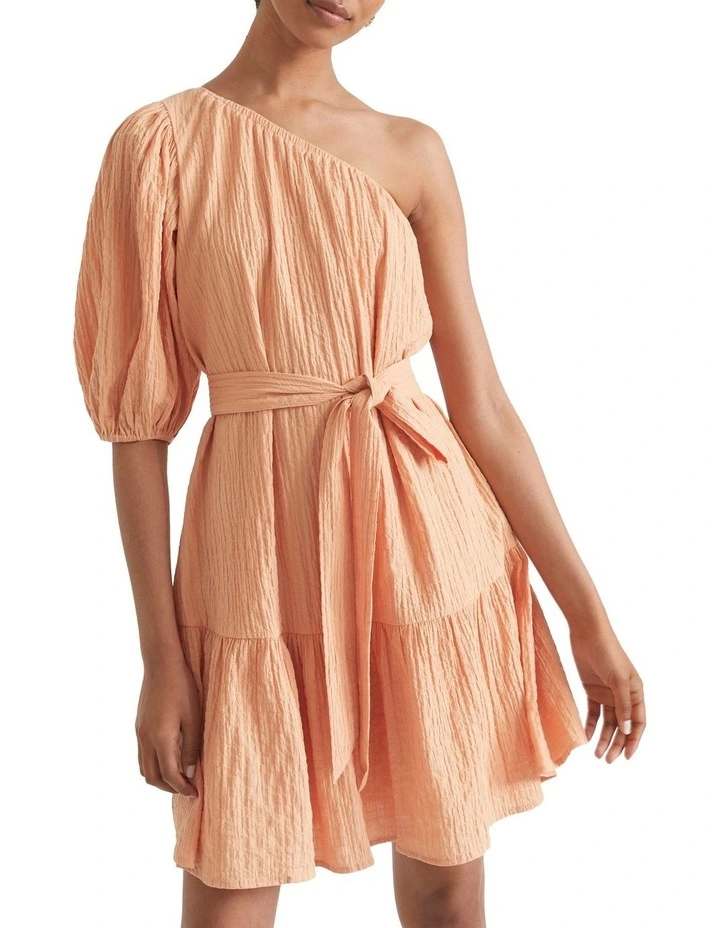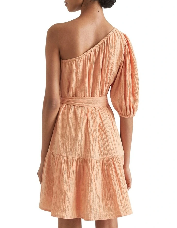 Crafted from a beautiful seersucker cotton, this dress is a summer must-have. It features a one-shoulder design and a single puffed sleeve, leading into a self-belt at the waist and a ruffled mini skirt. The dress has a light stretch.