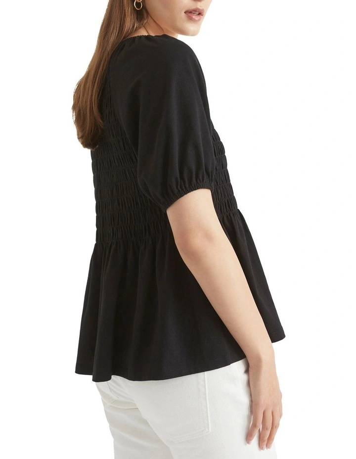 With a V neck and smocked bodice, this top has a timeless feel. It has short sleeves with elasticated cuffs, and ends in a soft peplum hem.