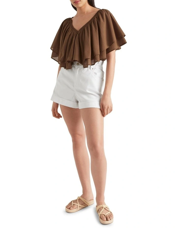With a statement flutter collar and sleeves, this top is an instant outfit-maker. It is crafted from a beautiful lightweight cotton-blend voile, and features a V neck and a loose fit through the body. By choosing our cotton products, you are supporting our investment in the Better Cotton mission.