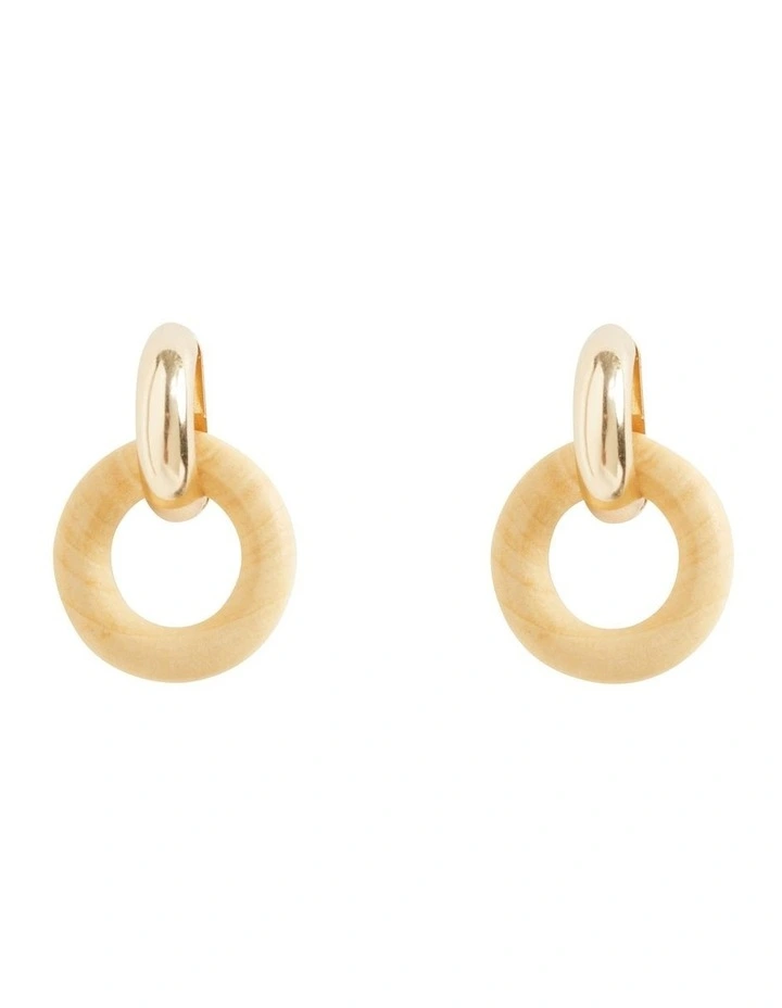 These earrings pair natural wood hoops with shiny textured metal. They close with a stud backing.