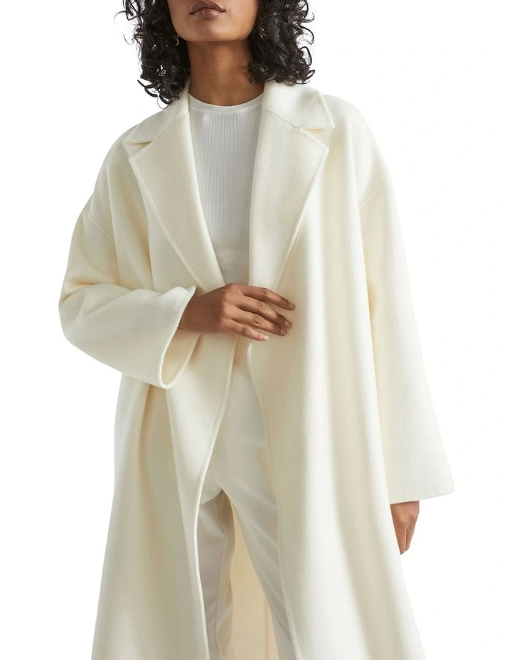 In premium pure wool, this coat is beautiful to wear and to style. It features a wide collar leading into a wrap style, closing with a detachable belt. The coat falls to knee length.