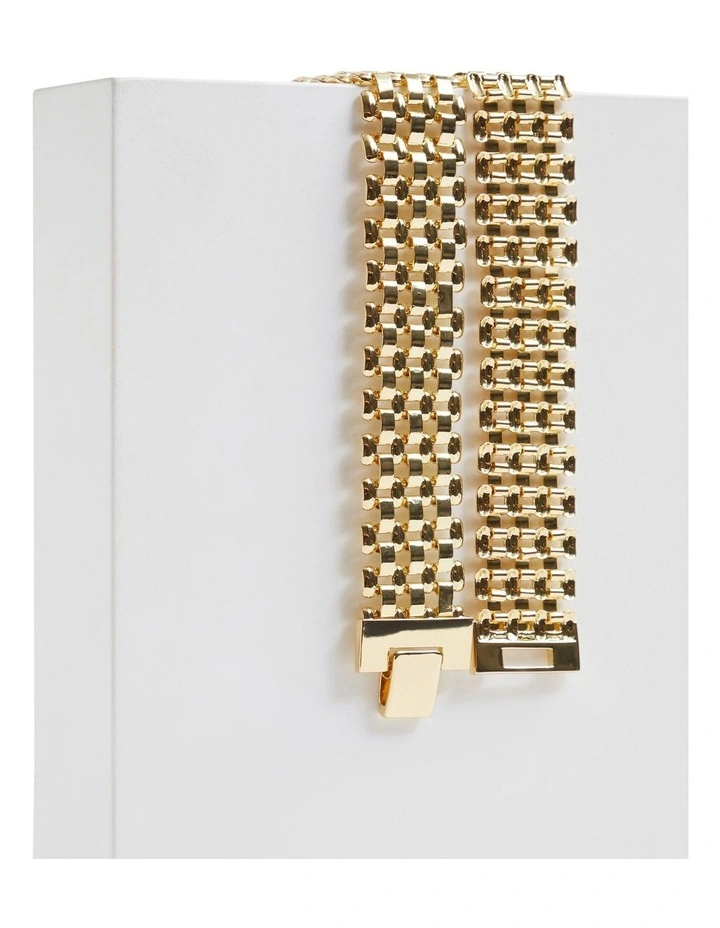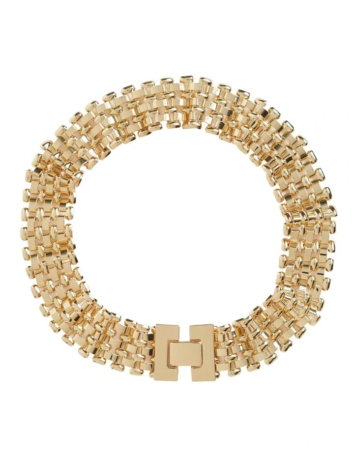 Crafted from a premium gold alloy, this necklace is the ideal finishing touch for your outfit. It is designed in a wide woven link style, and sits at the base of the neck in a choker style. It closes with a clasp at the back of the neck.